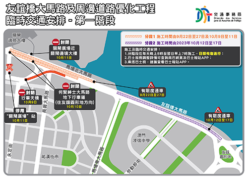 首階段工程範圍包括馬場北大馬路至關閘廣場及友誼橋大馬路部分,施工時間由今日起至9月27日及10月9日至11日,以及10月12日至17日;第二階段工程範圍主要為友誼橋大馬路,施工時間由10月18日至30日;第二階段工程範圍為友誼圓形地,施工時間由10月31日至11月5日。