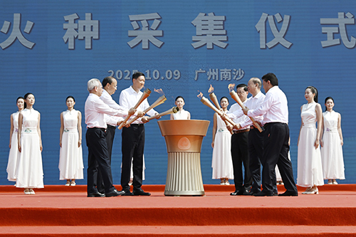 在我國自主設計建造的首艘大洋鑽探船“夢想號”的見證下,十五運會和殘特奧會火種採集儀式在位於廣州南沙區的廣州海洋地質調查局科考碼頭舉行。儀式上,火種護衛隊將來自1,522米深處的海底“源火”安放至“源火”台,採火少女在“源火”台引燃手中的採火棒,中共中央政治局委員、廣東省委書記黃坤明,十五運會和殘特奧會組委會主任、國家體育總局局長高志丹,殘特奧會組委會執行主任、中國殘聯理事長周長奎,十五運會和殘特奧會組委會執行主任、香港特別行政區行政長官李家超,十五運會和殘特奧會組委會執行主任、澳門特別行政區行政長官岑浩輝,十五運會和殘特奧會組委會執行主任、廣東省委副書記、省政府黨組書記、深圳市委書記孟凡利共同登台,接過採火棒,一起點燃十五運會和殘特奧會火種盆,寓意粵港澳三地攜手共進、同心築夢。