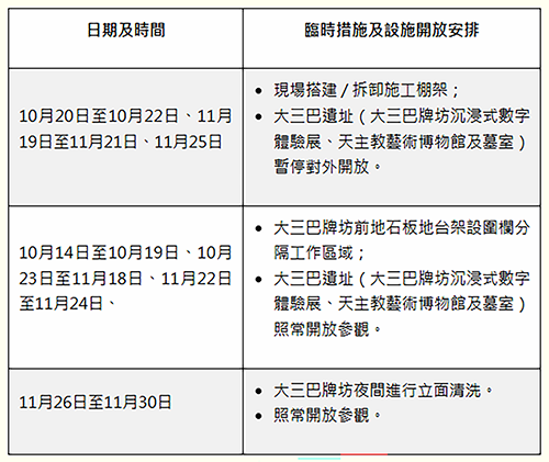 文化局表示,按照今年初公佈的修復計劃,大三巴銅像第二階段修復工作將於本月14日起至11月30日實施,屆時將對位於大三巴牌坊第二層的四座銅像進行修復保養。期間,大三巴牌坊正立面將會設置施工棚架;因應施工需要及保障公眾安全,大三巴牌坊(包括遺址內的“時空穿梭‧遊歷三巴”大三巴牌坊沉浸式數字體驗展、天主教藝術博物館及墓室)將於部分時段暫停對外開放。施工期間大三巴牌坊前地的石板地台將設置圍欄分隔工作區域,公眾倘欲查詢相關詳情,可於辦公時間致電2836 6320。