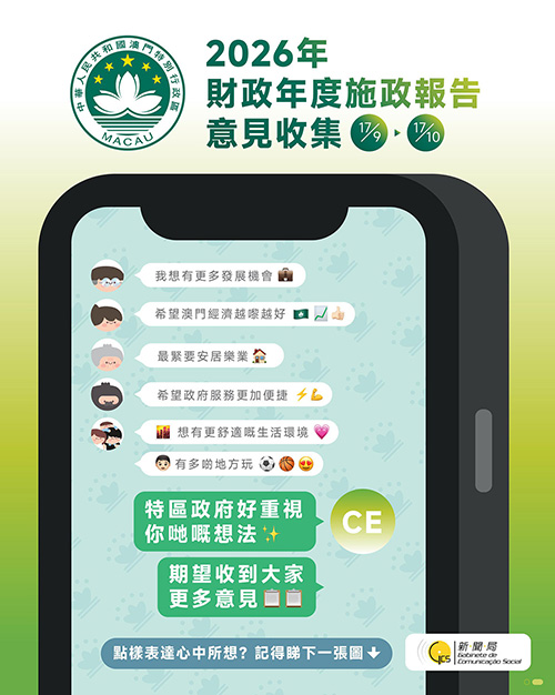 【本報訊】特區政府正就制訂《2026年財政年度施政報告》收集公眾意見。本次意見收集工作為期一個月,將於本週五(17日)結束,特區政府呼籲社會各界把握機會積極提出意見和建議。