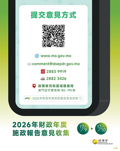 施政報告意見收集期間,居民可透過“一戶通” 手機應用程式和網站(www.mo.gov.mo),電話留言專線(2883 9919)、傳真(2882 3426)、電郵(comment@dsepdr.gov.mo)提交對施政報告的意見。公眾也可選擇郵寄至政策研究和區域發展局(澳門氹仔體育路185-195號),表達對明年度施政報告的意見。