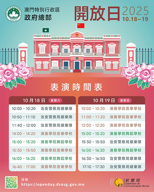 公眾可瀏覽開放日專題網頁 https://openday.dsasg.gov.mo ,了解更多活動詳情,也可透過360度全景拍攝畫面,透過虛擬旅程,從不同角度了解政府總部的面貌。公眾還可下載“澳門特首辦”手機應用程式,閱覽政府總部開放日的相關資訊。