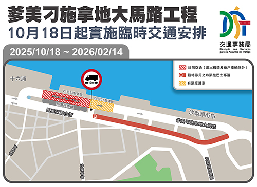 根據當局公佈的相關臨時交通措施,由本週六起至11月14日,介乎21至23號碼頭對出的一段爹美刁施拿地大馬路實施封閉交通(進出碼頭及商戶車輛除外);期間,港停車場及內港蜆殼油站維持正常運作,而使用油站之駕駛者需經臨時出口駛離。配合施工安排,由本週六起至明年2月14日,臨時停用巴素打爾古街近港停車場出口至典雅灣對出的一段時限性巴士專道,並開放予所有類型車輛通行。工程期間亦將禁止長度超過十米的車輛由巴素打爾古街近港停車場出口左轉駛入爹美刁施拿地大馬路,而介乎23至26號碼頭對出的一段爹美刁施拿地大馬路則有限度通車及停用上落客貨區。