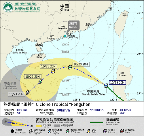 氣象局表示,按現時預測,“風神”將於今日晚間至明日凌晨在本澳以南約400公里掠過,屆時本澳風勢會進一步增強,對本澳造成的影響增加,因此將視乎“風神”發展及本澳風力變化,今日傍晚至晚間評估直接發出三號風球。天氣方面,預料今日晚間至週三多雲有雨,最低氣溫將下降至18℃左右。