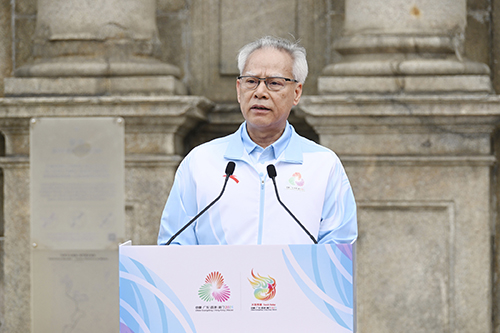 岑浩輝在收火儀式上致辭表示,在全運聖火的映照下,共同見證第十五屆全國運動會澳門賽區火炬傳遞的圓滿完成。全運聖火象徵光明與希望,火炬傳遞,是精神的傳遞,更是力量的凝聚。聖火穿越澳門的大街小巷,由50位火炬手接力相傳,每一步都展現了澳門奮發同行的城市風采,每一次交接都傳承團結拼搏的體育精神。此刻,聖火在大三巴牌坊前匯聚,共同點亮了“灣區同心  全運同行”的璀璨之光。