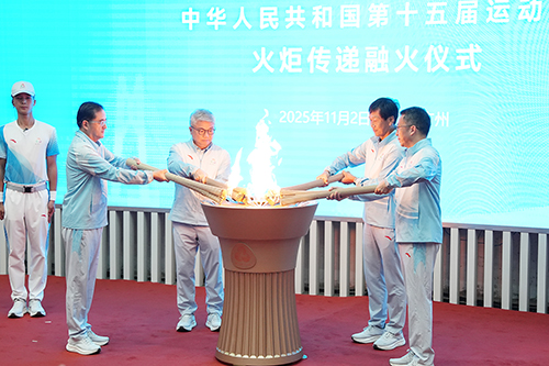 【本報綜合報道】綜合新華社、中新社、央視新聞報道,第十五屆全國運動會火炬傳遞於昨日在香港、澳門、廣州、深圳同步舉行。在火炬傳遞活動結束後,四地代表將火種護送至廣東奧林匹克體育中心並舉行融火儀式。伴隨著四城傳遞的聖火融為一體,標誌著粵港澳大灣區首次聯合承辦的全運會火炬傳遞活動圓滿收官,也為11月9日的開幕式主火炬點燃奠定莊重序幕。