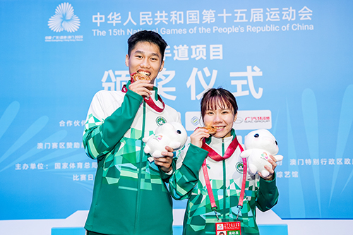 欣聞澳門空手道運動員容君灝和方文慧在第十五屆全國運動會男子-67公斤級及女子-55公斤級比賽中雙雙奪冠,運動員許家誠和李康喬分別於男子-67公斤級及女子-55公斤級比賽中奪得銅牌,再度刷新澳門體育事業新紀錄。本人謹代表澳門特區政府並以個人名義,向四位運動員表示最誠摯與最熱烈的祝賀,並再次向本屆全運會賽場上的澳門參賽人員及澳門賽區的每位工作人員致以親切的問候。