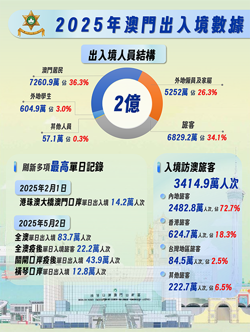 數據顯示,今年截至本月9日晚8時的全澳出入境人員結構中,澳門居民7,260.9萬人次,佔36.3%;旅客6,829.2萬人次,佔34.1%;外地僱員及家屬5,252萬人次,佔26.3%;外地學生604.9萬人次,佔3.0%;其他人員57.1萬人次,佔0.3%。至於入境訪澳旅客則累計3,414.9萬人次,其中內地旅客2,482.8萬人次,佔72.7%;香港旅客624.7萬人次,佔18.3%;台灣地區旅客84.5萬人次,佔2.5%;其他旅客222.7萬人次,佔6.5%。