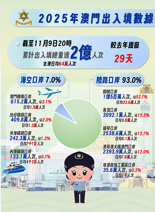 【本報訊】在中央接連推出人員往來惠澳政策及多項通關便利措施疊加效應下,本澳各口岸出入境人流持續攀升。據治安警察局公佈的出入境數據,截至本月9日晚8時,本年度全澳出入境總人次突破2億,較去年提前29天,刷新最快達到2億通關客流量的紀錄;日均通關客流量則達64萬人次,較去年同期增長9.8%。