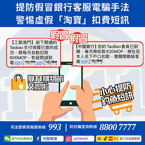 通告提到,司警局近日發現有騙徒假冒澳門中銀及工銀澳門的名義,向市民濫發虛假短訊,訛稱“TaoBao支付保障已簽約成功”或“TaoBao會員已到期”將會扣費,誘騙市民回撥短訊內附帶的電話號碼。當市民一旦回電,騙徒便會冒充銀行職員,再指示轉至通訊軟件聯絡,繼而索取銀行或信用卡資料、要求下載APP進行同屏,甚至轉賬至指定戶口。