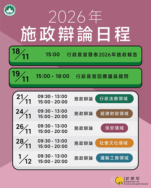 此外,新聞局屆時也在Facebook葡文專頁(www.facebook.com/macaogcspt)及英文專頁(www.facebook.com/macaogcsen)發佈2026年施政報告的資訊。