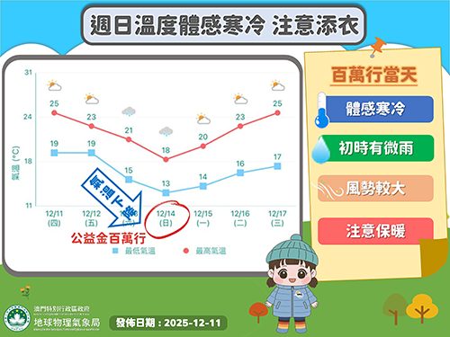 氣象局昨日發佈天氣特別推送消息指,昨日及今日受偏東氣流影響,日間天氣和暖,但隨著一道冷鋒明日抵達華南沿岸,本澳天氣漸轉多雲及有幾陣雨,當日晚間氣溫將顯著下降。而受冬季季風影響,週日至下週一(14日至15日)最低氣溫預料將下降至13℃左右,並伴隨4至6級偏北風。