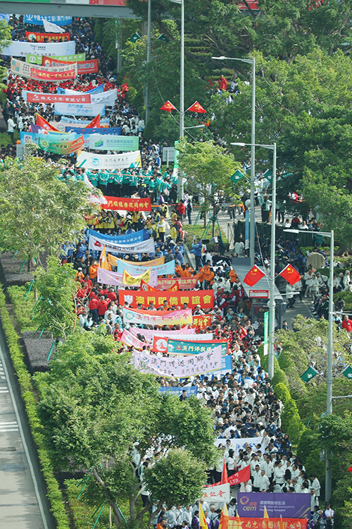 今屆百萬行起步儀式於昨日上午10時在觀音像旁所設的大會主禮台舉行,行政長官岑浩輝,全國政協副主席何厚鏵,中聯辦副主任黃柳權,外交部駐澳特派員公署署理特派員程雷,駐澳部隊副司令員戴勁松,立法會主席張永春,天主教澳門教區主教李斌生,中華總商會會長崔世昌,中國企業協會會長傅建國,澳門日報讀者公益基金會名譽會長廖澤雲、胡順謙及會長賀定一、副會長陸波等出席主禮。