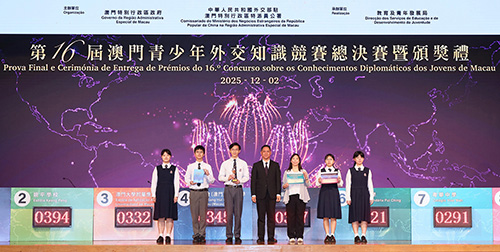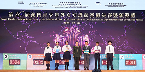 龔志明致辭時表示,習近平主席在紀念中國人民抗日戰爭暨世界反法西斯戰爭勝利80周年招待會上強調:“任何時候,我們都要堅持走和平發展道路,堅定守護世界和平安寧,攜手構建人類命運共同體。”澳門作為“一國兩制”成功實踐的典範,積極融入國家發展大局,肩負講好中國故事、傳播澳門聲音的使命。澳門青少年外交知識競賽是特區政府與外交公署合作的品牌活動,激發澳門青年對國家外交事務的興趣,展現對構建人類命運共同體的理解與擔當。特區政府將持續深化與外交公署合作,舉辦系列推廣外交知識的活動,支持青年立足澳門、胸懷祖國、放眼全球,運用所學在國際舞台上講好中國故事、澳門故事。