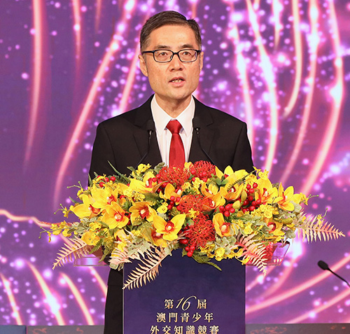 外交部發言人、外交部新聞司副司長郭嘉昆在視頻致辭中表示,澳門青少年外交知識競賽已連續舉辦了16屆,成為了一項品牌活動。習近平主席視察澳門期間強調青年是澳門的希望和未來,是建設澳門和國家的有生力量。澳門青年要心繫澳門,心繫國家,展現志存高遠腳踏實地的良好風貌。當今世界進入百年未有之大變局,十五五規劃建議擘畫了未來五年國家經濟社會發展宏偉藍圖。希望澳門青年珍惜時代機遇,樹立遠大志向,當好“一國兩制”事業的建設者和接班人,為澳門更好融入祖國發展貢獻青春和力量。