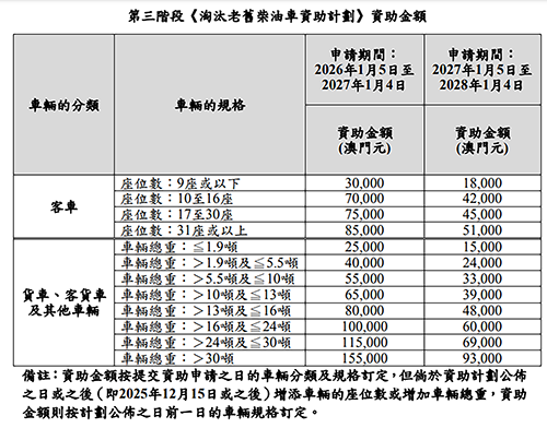 是次資助計劃的資助對象為2019年12月31日或之前註冊及登記的老舊柴油車車主,但不包括在2025年12月15日或之後已被取消註冊且其後重新註冊的老舊柴油車車主。首年的申請期由昨日起至2027年1月4日,資助金額由25,000澳門元至155,000澳門元不等。第二年的申請期由2027年1月5日至2028年1月4日,資助金額由15,000澳門元至93,000澳門元不等。