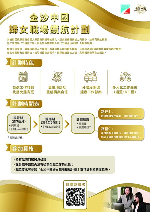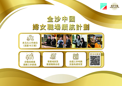【本報訊】為協助因照顧家庭或個人原因離開職場的婦女逐步重建職業能力與信心,順利續航職場,勞工事務局和金沙中國有限公司合作推出“金沙中國婦女職場續航計劃”。是次計劃將結合小組支援、專業培訓、工作實踐以及彈性工作時數安排等措施,讓已離開職場的婦女,逐步適應工作環境,續航職場。有意參加者可由今日起至本月16日期間網上遞交申請。