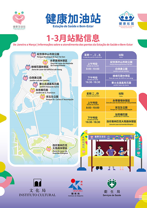 他介紹, “健康加油站”作為首個整合“文化滋養、科學運動、健康資訊”三大元素於同一社區場景的恆常化服務站點,首階段會於紀念孫中山市政公園、白鴿巢公園、綠楊花園休憩區、華士古達嘉馬花園、永寧廣場休憩區、宋玉生公園、加思欄花園、氹仔奧林匹克大馬路休憩區8個位置設立站點,未來計劃擴展至12個站點,在社區恆常化為居民提供便捷的健康促進服務,實現健康資源“隨手可得、隨心即享”,攜手實現“活力澳門、文化澳門、幸福澳門”施政願景。站點運作時間為每週星期一至五(政府假期、惡劣天氣及維護日除外)上午8時至10時及下午4時半至6時半。各站配有“健康加油站”橫額,工作人員亦會佩戴相關胸針,以便居民識別。