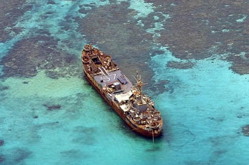 1999年,菲方派軍艦在仁愛礁非法“坐灘”,嚴重侵犯中國領土主權。中方當即提出嚴正交涉,要求菲方立即拖走該艦。菲方聲稱該船“缺少零部件”無法拖走。此後,中方多次提出嚴正交涉,菲方雖再三承諾把該艦從仁愛礁撤走,但一直拖延不動。過去十多年來,菲方一直向該軍艦運送鋼材、水泥等建築材料,試圖將其變為永久軍事據點。