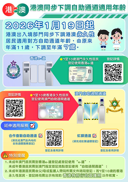 據介紹,自今日起,港澳兩地永久性居民使用對方自助過關通道(即香港的e-道及澳門的傳統兩門式自助通道)的適用年齡,由原來的年滿11歲下調至年滿7歲;與此同時,兩地年滿18歲的合資格非永久性居民可使用本地自助服務機進行預先登記,成功登記後約3小時即可使用對方自助過關通道(香港的e-道及澳門的傳統兩門式自助通道)入出境。此外,同日起,年齡介乎7歲至10歲的港/澳永久性居民,也可在父/母或監護人陪同下,帶同證明文件親臨對方口岸的自助通關登記處辦理登記手續,成功登記後約30分鐘,即可使用對方自助通道通關。