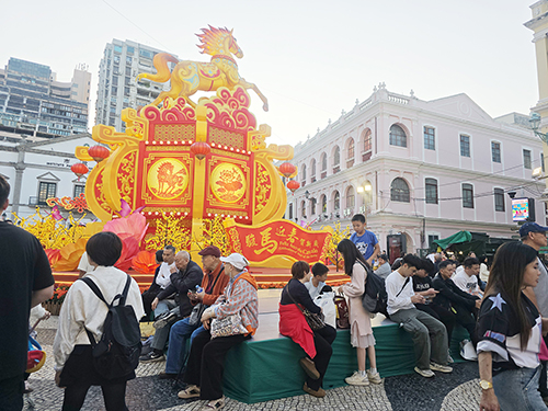 丙午馬年日近,澳門大小街巷張燈結綵,喜氣洋洋,多處旅遊地標連日來人流暢旺。昨日迎來內地春節長假首日,關閘廣場的入境風雨走廊上午人如潮湧,不少旅客一家大小結伴來澳遊玩,綜合度假休閒企業穿梭巴候車區大打蛇餅。在中區議事亭前地一帶及氹仔官也街,旅客大軍或在手信店掃貨,或對著節慶燈飾打卡拍照。此外,亦有一些旅客專程來澳置辦年貨,手提大包小包的戰利品,收穫豐富。有手信店的店主對新春市場充滿信心,其受訪稱,春節是銷售旺季,店中備貨充足,還有優惠促銷措施,希望能為顧客帶來更好購物體驗。