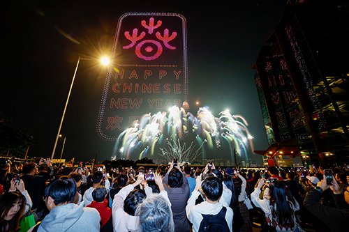 首場“金駿雲翔 歡樂春節”2026無人機煙花匯演已在年初三晚璀璨上演。第二場匯演將於今晚9時於旅遊塔對出海面絢麗舉行,歷時約15分鐘的無人機融合煙花的表演,在“人日”當晚祝願大家喜樂安康。第三場匯演則安排在正月十五(3月3日)晚上9時舉行,和觀眾一同共度元宵佳節。