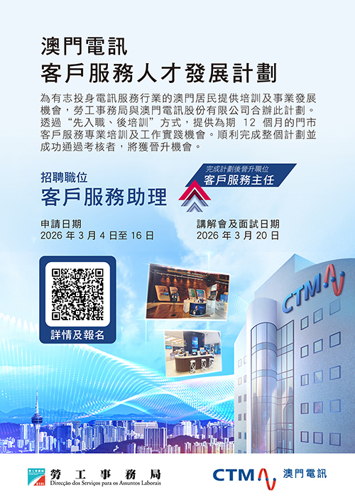 【本報訊】勞工事務局與澳門電訊股份有限公司合作推出“客戶服務人才發展計劃,以“先入職、後培訓方式,結合客戶服務專業及工作實踐培訓,助力本澳居民制定就業發展路徑與技能提升機會,計劃由明(4)日起接受申請。