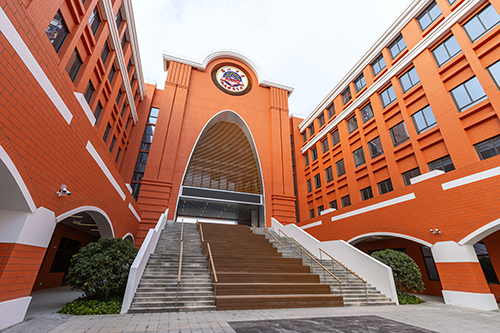 中學延續幼稚園和小學校舍的古典端莊歐式建築風格,並巧妙運用地形特點,採用向北側山體打開的佈局,使校園空間感更廣闊,打造“融景入園”、綠意盎然的優質校園,讓莘莘學子在優美環境中學習成長。