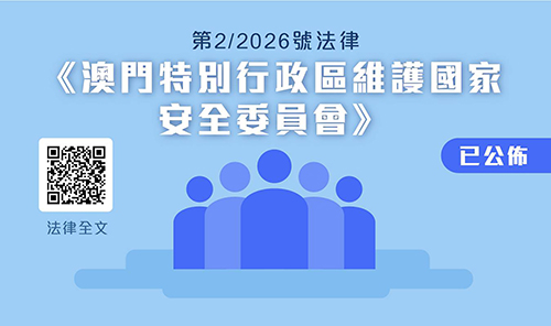 【本報訊】上週四在立法會大會獲全票通過的第2/2026號法律《澳門特別行政區維護國家安全委員會》,已刊登於昨日出版的《特區公報》,由今日起正式生效。該法律訂定澳門特別行政區維護國家安全委員會(下稱“國安委”)的職責、組成及運作的基本制度,賦予國安委更堅實的法律基礎,是澳門特區完善國家安全法律體系、強化國家安全體制頂層設計的重要舉措。此外,第7/2026號行政法規《澳門特別行政區維護國家安全委員會秘書處的組織及運作》亦於同日在《特區公報》刊登,同步由今日起生效。