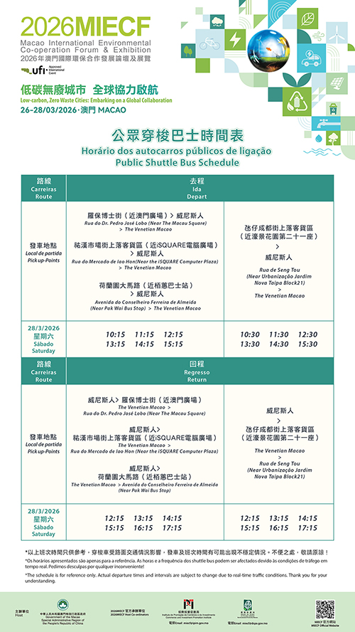 展會最後一日為“綠色公眾日”,公眾可免費入場,大會將安排環保宣教活動、技術展示與互動體驗,鼓勵公眾參與低碳生活與無廢城市建設。為便利市民綠色出行,大會當天提供4條免費純電動穿梭巴士路線往返澳門中區、北區及氹仔與MIECF會場,同時安排技術參觀環節,組織與會者參觀路氹城生態保護區及澳門垃圾焚化中心,加強環保技術交流。