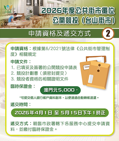 公開競投的評分準則包括競投者的營運策略、經驗、貨品種類的多元性、攤位每日經營時間及支付工具的便利性等標準進行評審。競投申請須符合相關資格及要求,每名競投者只可遞交1份申請表及競投計劃書。有意投標者可由即日起至5月15日中午1時正,親臨市政署轄下各服務中心遞交申請表及競投計劃書等文件,同時須繳付臨時保證金。