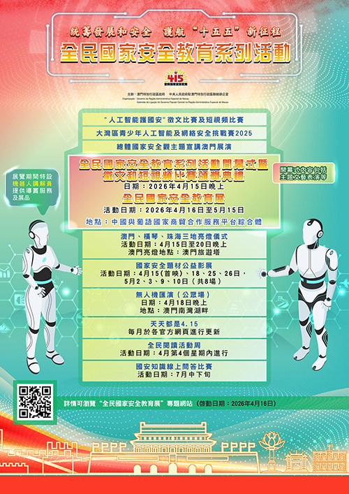 2026年“全民國家安全教育系列活動”重點包括:“人工智能護國安”徵文比賽及短視頻比賽;大灣區青少年人工智能及網絡安全挑戰賽;總體國家安全觀主題宣講澳門展演;全民國家安全教育系列活動開幕式暨徵文及短視頻比賽頒獎典禮(舉辦日期:4月15日晚,地點:中國與葡語國家商貿合作服務平台綜合體);全民國家安全教育展( 展期:4月16日至5月15日);澳門、橫琴、珠海三地亮燈儀式(舉辦日期:4月15日至20日晚,澳門亮燈地點:旅遊塔); 國家安全題材公益影展活動(4月15日(首映)、18、25、26日,5月2、3、9、10日共8場);無人機匯演公眾場(舉辦日期:4月18日晚,地點:澳門南灣雅文湖畔);天天都是4.15(每月於各官方網頁持續更新國家安全資訊);全民閱讀活動周(活動日期:4月第4個星期內進行);國安知識線上問答比賽(活動日期:7月中下旬)。