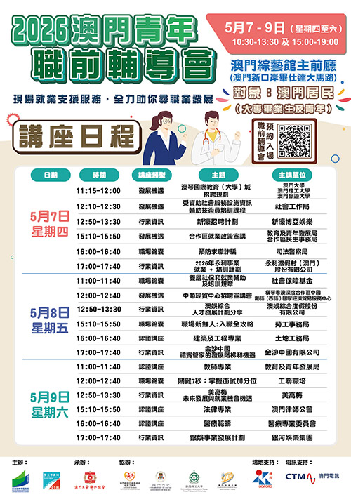 【本報訊】為協助澳門青年順利開展職業生涯及投入就業巿場,教育及青年發展局和勞工事務局將於5月7日至9日一連三日在澳門綜藝館聯合舉辦2026“澳門青年就業配對會”(下稱配對會)及“澳門青年職前輔導會”(下稱職輔會)。配對會及職輔會兩項活動由今日起可於網上預約及報名。