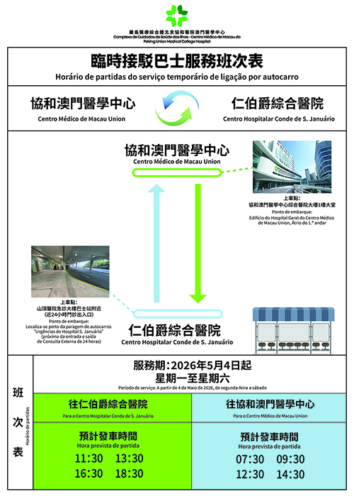 【本報訊】為便利往來仁伯爵綜合醫院與協和澳門醫學中心的就診患者,衛生局聯同協和澳門醫學中心於下週一(5月4日)起推出臨時接駁巴士服務。該服務逢週一至週六運行,時間為上午7時30分至下午6時30分,每日共設8個班次,供有需要人士使用。