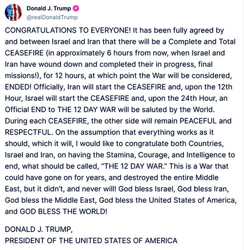 【本報綜合報道】據香港中通社及新華社北京/華盛頓/耶路撒冷/德黑蘭6月24日消息,美國總統特朗普23日傍晚在社交媒體“真實社交”上宣佈,以色列和伊朗已就“全面徹底停火”達成一致,這場為期12天的衝突即將結束。