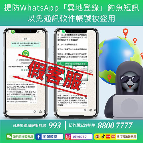 司警局反詐騙協調中心提醒,WhatsApp絕對不會透過 SMS 短訊或軟件訊息要求用戶點擊“任何連結”處理賬戶停權問題;WhatsApp用戶務必在應用程式中認清顯示有“藍色剔號”特徵的真實WhatsApp官方賬號;倘有親友透過任何通訊軟件提出索款要求,應立即循其他途徑與對方核實身份。如有懷疑,可使用司警局“反詐程式”查詢風險指數或上報資料,又或致電司警局防詐騙查詢熱線 88007777 及報案熱線 993 求助。