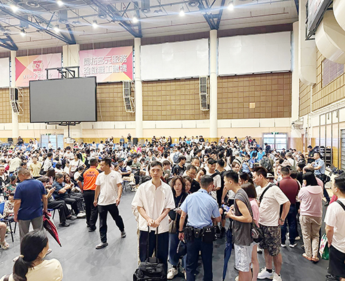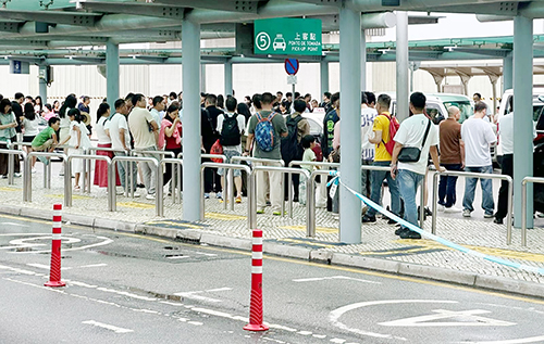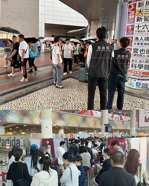 打風期間,市內公共交通停運下,的士需求急升,當局安排旅客在關閘工人體育場取籌輪候的士。昨日上午可見,現場有數百人等候的士,有多名警員在場維持秩序和協助登記取籌,等候取籌的乘客大排長龍,隊伍延伸至工人球場館外“打蛇餅”。據當局公佈,昨日中午12時,關閘工人體育場約有600人等候的士,橫琴口岸入境大堂打的人數則約有130人,而同一時間僅得約500輛的士營運,乘客候車時間需1個小時左右。至昨日下午1時,氣象局改掛三號風球,關閘口岸人來人往,公共交通恢復後大批旅客及居民同一時間湧至,幾乎每個站點前都排長龍。在復運初期,巴士加開班次、疏導人流,亦有工作人員在場指引居民搭車及維持秩序。有等車旅客反映,本來想趁黃金週來澳好好遊玩一番,不料遇上打風,巴士、發財巴暫停,惟有取籌輪候搭的士,無奈等車時間太長,認為當局在極端天氣下應有更多預案應對旅客的出行需求。