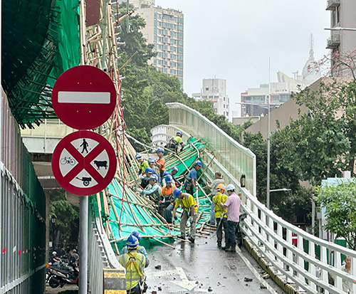 【本報訊】颱風“麥德姆”昨日襲澳,民防行動中心共錄得16宗事故報告,期間正拆卸重建的台山嘉翠麗大廈外牆棚架倒塌,壓在對開一段行車天橋上,所幸並無造成人員傷亡,事後需封路清理現場,周邊道路及天橋至昨日晚間恢復通車。