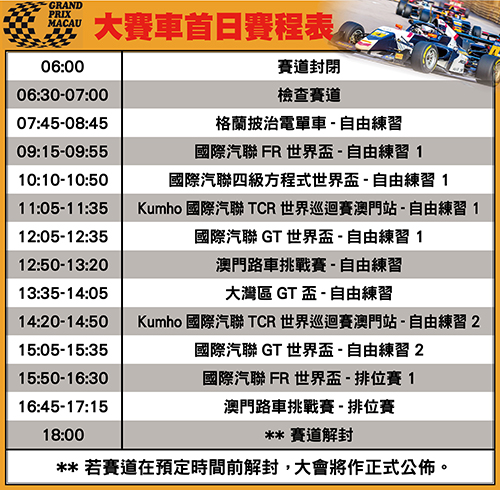【本報訊】第72屆澳門格蘭披治大賽車今日起一連四日上演七項賽事,其中首次舉辦的國際汽聯四級方程式世界盃將於上午進行自由練習,而另一項焦點賽事國際汽聯FR世界盃則上演排位賽。今屆大賽車與第十五屆全國運動會同期舉行,氣氛濃厚,週六、日賽事的門票已基本售罄,旅遊局預計四日大賽車期間訪澳旅客將達50萬人次。