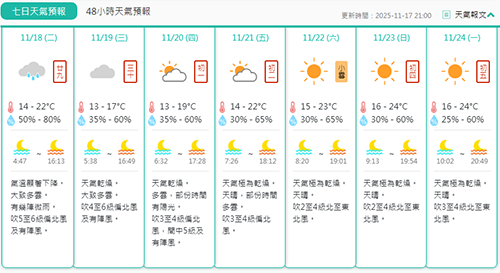 氣象局的七日天氣預報顯示,今日氣溫顯著下降,大致多雲,有幾陣微雨,吹5至6級偏北風及有陣風,最高氣溫約為22℃, 晚間氣溫將下降至最低約14℃。明日及後日天氣乾燥,最低氣溫料進一步跌至13℃,吹3至4級偏北風,而相對濕度亦降至35%至60%。