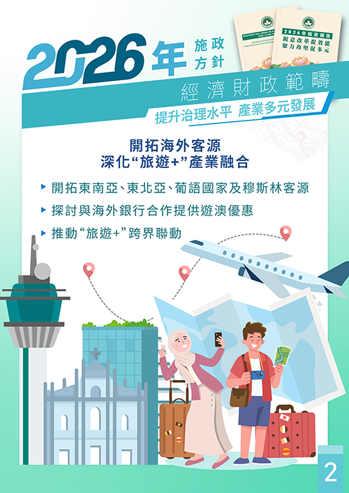 在綜合旅遊休閒業方面,將在鞏固大中華地區客源市場的同時,致力拓展東南亞、東北亞等國際客源市場。優化海外推廣網絡,設立並善用政府駐外經濟貿易旅遊文化辦事處,聯動綜合旅遊休閒企業,大力推廣澳門的多元化盛事活動和社區特色旅遊元素。根據旅客偏好優化宣傳策略,強化與海內外大型旅遊平台和電子支付平台的合作,豐富“旅遊+跨界融合產品,提升旅遊服務質量,進一步鞏固澳門世界旅遊休閒中心的地位。