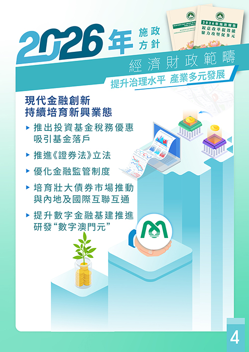 在現代金融業方面,將不斷完善澳門的金融軟硬基建,促進行業創新發展。重點加強《投資基金法》的海內外推廣,並推出具競爭力的稅務優惠措施,吸引更多基金落戶澳門。持續培育債券市場、財富管理等新業態,強化銀行業及保險業的風險防控與應變能力。繼續推進金融科技發展,提升電子支付與跨境金融的便利性,加快“數字澳門元的研發工作。