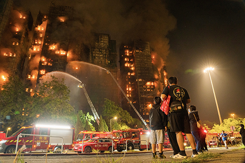 截至昨晚午夜12時許,火災還未撲滅。據香港中通社報道,昨晚10時許,現場仍不時傳出爆炸聲,7棟起火的大廈從外部觀察,其中 3棟大樓仍然整棟燃燒,其他大樓部分樓層冒出火光,1棟火勢原來較小的大樓中低層突然燃起烈火,消防人員仍在不斷射水降溫。現場有消防無人機不時在空中勘察火場,住宅附近的橋站滿了關注火警的市民。有住戶受訪表示,下班到家後才發現火災,也有住戶說自己因為出門所以逃過一劫。