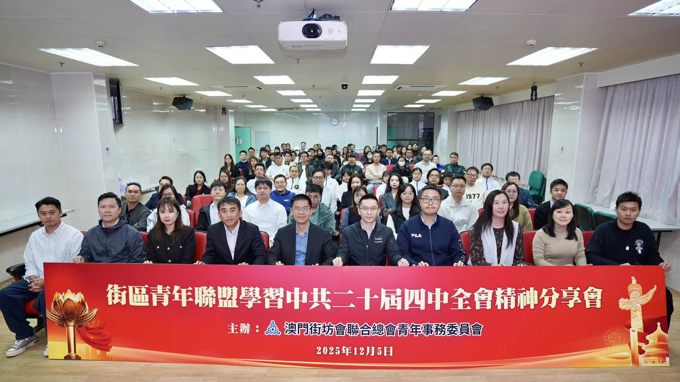【本報訊】街坊總會青年事務委員會聯同街區青年聯盟於12月5日舉辦“街區青年聯盟學習中共二十屆四中全會精神分享會”,分享會在街坊總會社區服務大樓二樓舉行。活動邀請中聯辦社會發展部副部長姜正宇為一眾青年分享中共二十屆四中全會精神。中聯辦社會發展部處長羅振宇、副處長鄭奕成、街坊總會副理事長兼青委主任鄧文基、街區青年協會理事長陳偉良等近百名青年出席。