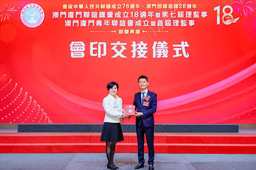 【本報訊】澳門廈門聯誼總會昨舉行慶祝澳門回歸祖國26周年,該會成立18周年暨第七屆理監事就職及澳門廈門青年聯誼會成立暨首屆理監事就職典禮。在典禮上,該會第六屆會長蘇建華將會印轉交予第七屆會長高美燕後,新一屆理監事在澳區全國政協委員、澳門福建同鄉總會會長陳明金監誓下宣誓就職,青年會第一屆理監事在澳門行政會委員、立法議員宋碧琪監誓下宣誓就職。