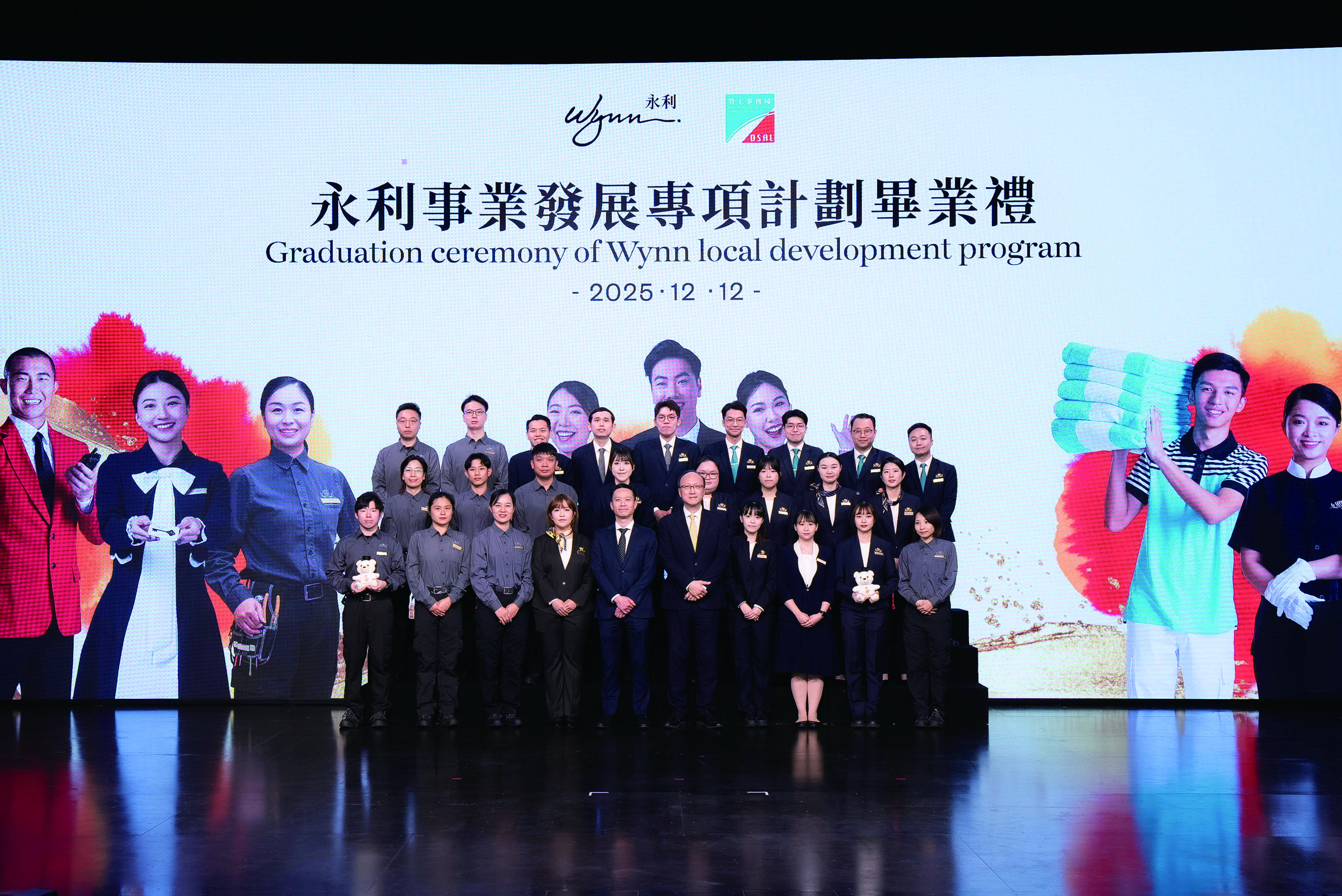 “永利事業發展專項計劃2025”採用“先入職、後培訓”模式,為學員提供為期12至36個月的專項培訓旅程,涵蓋管事部、餐飲、廚藝、設施管理及前堂服務等領域。今年計劃進一步擴大規模,全年共招募了67位學員。在典禮上,勞工事務局及永利管理層代表共同主持啟動儀式,並向新一期學員致送紀念品,鼓勵他們開啟職涯新篇章。同場亦舉行“永利事業發展專項計劃2024”結業儀式,向上屆28位畢業學員頒發結業證書和紀念品,他們在完成課程後均獲得晉升機會,部分更獲擢升至主任或相若職級,充份體現永利致力推動本地人才向上流動的承諾。