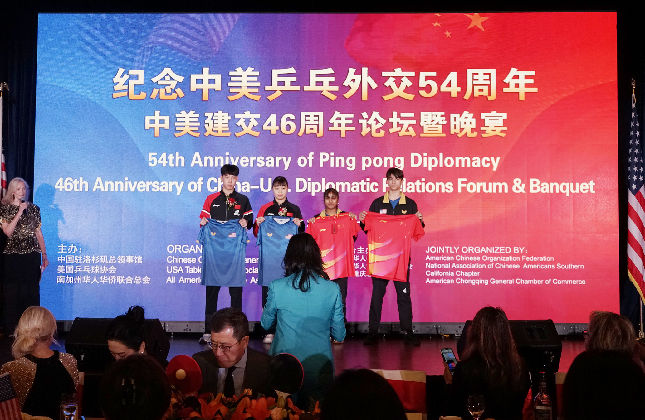 【本報綜合報道】據新華社洛杉磯12月23日消息,紀念中美“乒乓外交”54周年、中美建交46周年論壇暨晚宴當地時間22日在美國加利福尼亞州洛杉磯舉行,兩國體育界、政界和商界等數百人參加活動。
