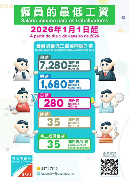 根據第14/2025號法律《修改第5/2020號法律<僱員的最低工資>》,調升後的僱員最低工資金額分別為:按月計算報酬,每月澳門元7,280元;按週計算報酬,每週澳門元1,680元;按日計算報酬,每日澳門元280元;按小時計算報酬,每小時澳門元35元;按實際生產結果計算報酬,平均每小時澳門元35元。