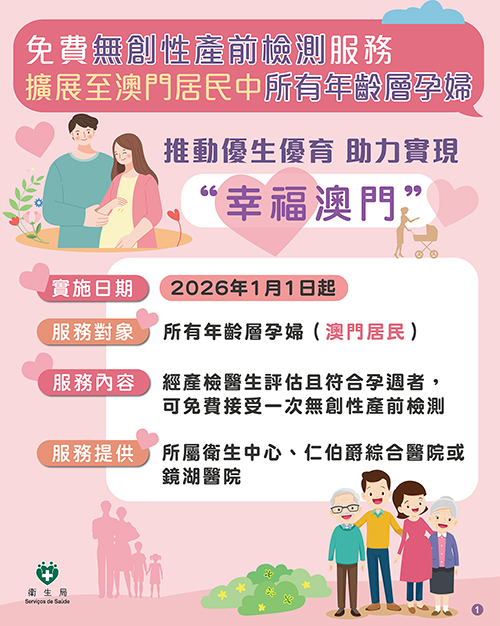 衛生局把無創性產前檢測(NIPT)服務擴展至澳門居民中所有年齡層的孕婦,有助更多家庭尤其高風險孕婦及早獲取關鍵的產前健康資訊,從而作出更適切的醫療與家庭規劃,以減輕家庭經濟與心理負擔,助力實現“幸福澳門”施政願景。