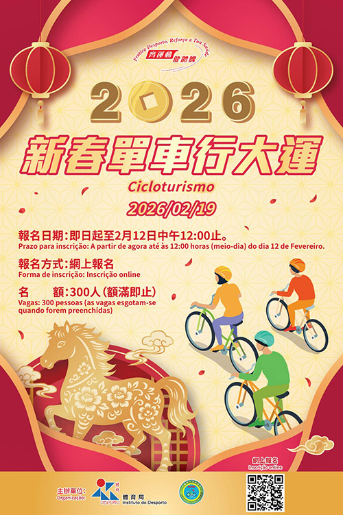 由體育局與中國澳門單車總會合辦的“新春單車行大運”,將於農曆正月初三(2月19日)舉行。活動對象為1956年或之後出生,且具備基本騎行經驗者。2012年或之後出生之參加者須由家長或監護人全程陪同。名額共300個,額滿即止。參加者須於活動當日上午8時30分前往奧林匹克體育中心三人籃球場側空地集合,並於9時正出發。騎行路線貫穿氹仔及路環,全程約20公里。參加者務必自備單車及安全帽,且全程配戴,單車不得載人。有意參加者可於即日起至2月12日中午12時,透過大會報名平台(https://buy.gooutmall.com/LNYcycling)進行網上報名,每次最多可報4人。